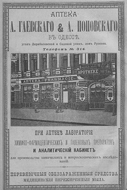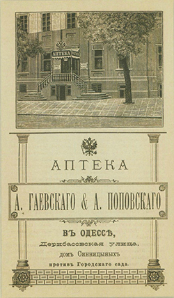 История «Аптеки Гаевского» начинается в 1878 году, когда молодой предприимчивый фармацевт Антон Эразмович Гаевский основал скромный аптекарский магазинчик в доме, расположенном на улице Тираспольской, 16. Спустя четыре года Антон Эразмович становится партнером знаменитого в те времена фармацевта В. Л. Пискорского, аптека которого располагалась в одном из лучших зданий Одессы – доме генеральши Синицыной (на этом месте в 1898-1899 годах был построен «Пассаж»). В начале 1883 года Гаевский выкупает эту аптеку, а вскоре его новым компаньоном становится не безызвестный коммерсант Александр Николаевич Поповский.